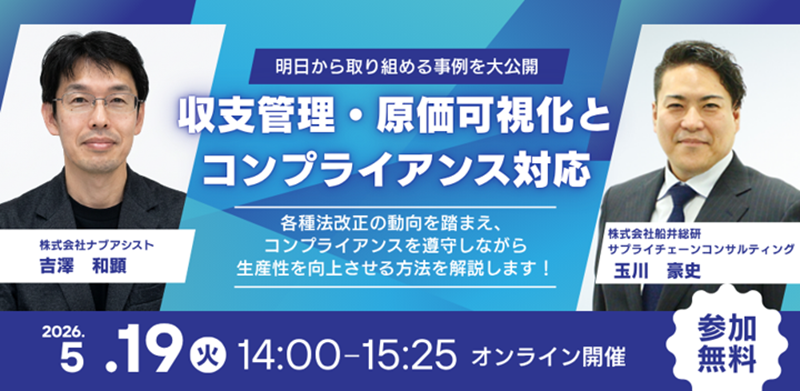 基調講演では、株式会社船井総研サプライチェーンコンサルティング様より、収支管理や原価可視化によるコンプライアンス対応について、事例を交えて講演頂きます。ぜひご参加ください。