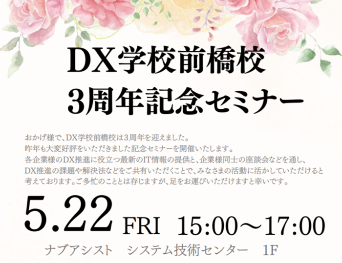 この度、DX学校前橋校は3周年を迎えました。過去2回の周年記念セミナー開催を重ねてきましたが、毎回大変ご好評をいただいております。今年もお客様の事例のご紹介を中心に、業務に役立つ生成AIの活用事例などを交えながら、DX学校前橋校同窓企業の交流を深めていきたいと思います。ぜひ足をお運びください。